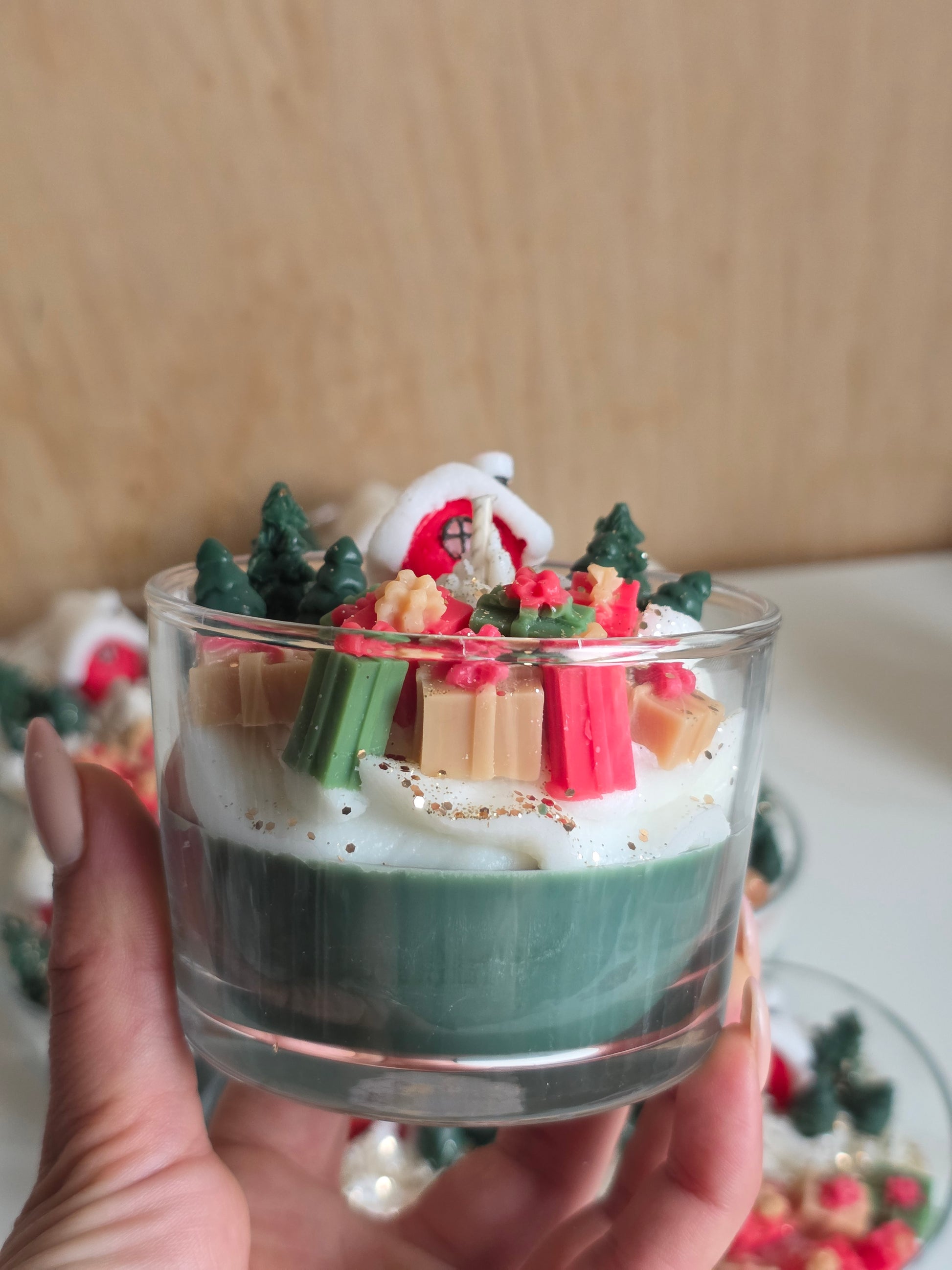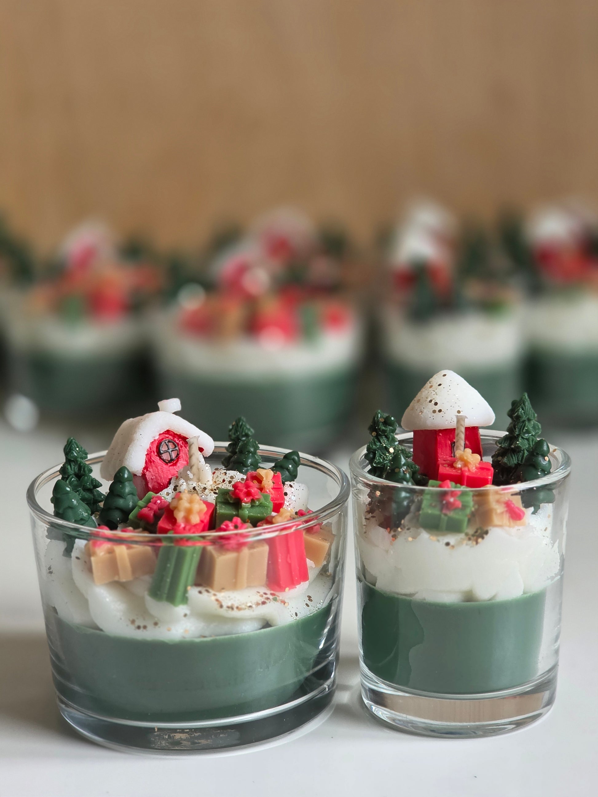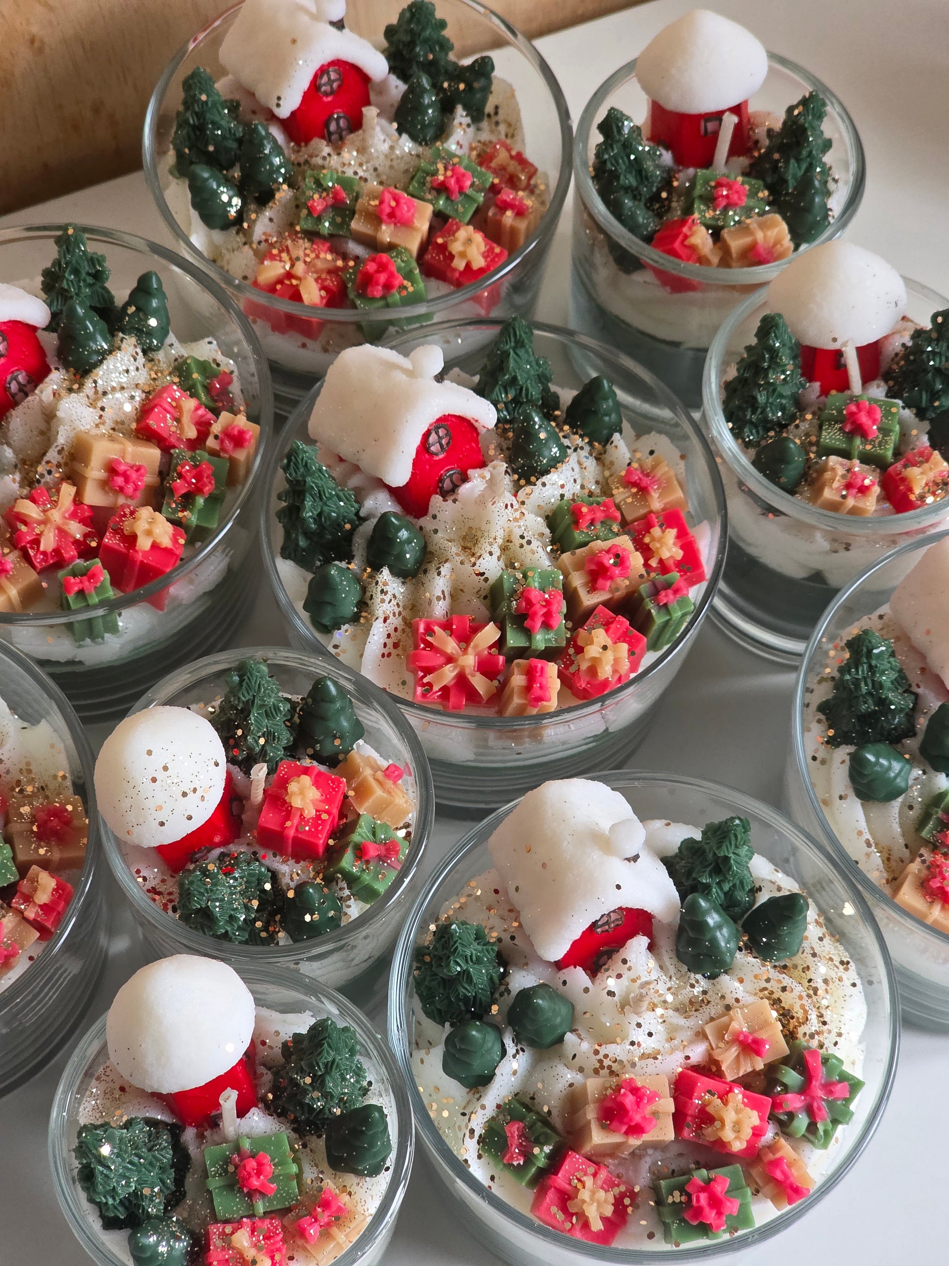 Adorned with miniature snowy cottages, evergreen trees, and tiny festive gifts, this candle transforms your space into a cozy holiday scene perfect for gifting or enjoying on a peaceful winter night.