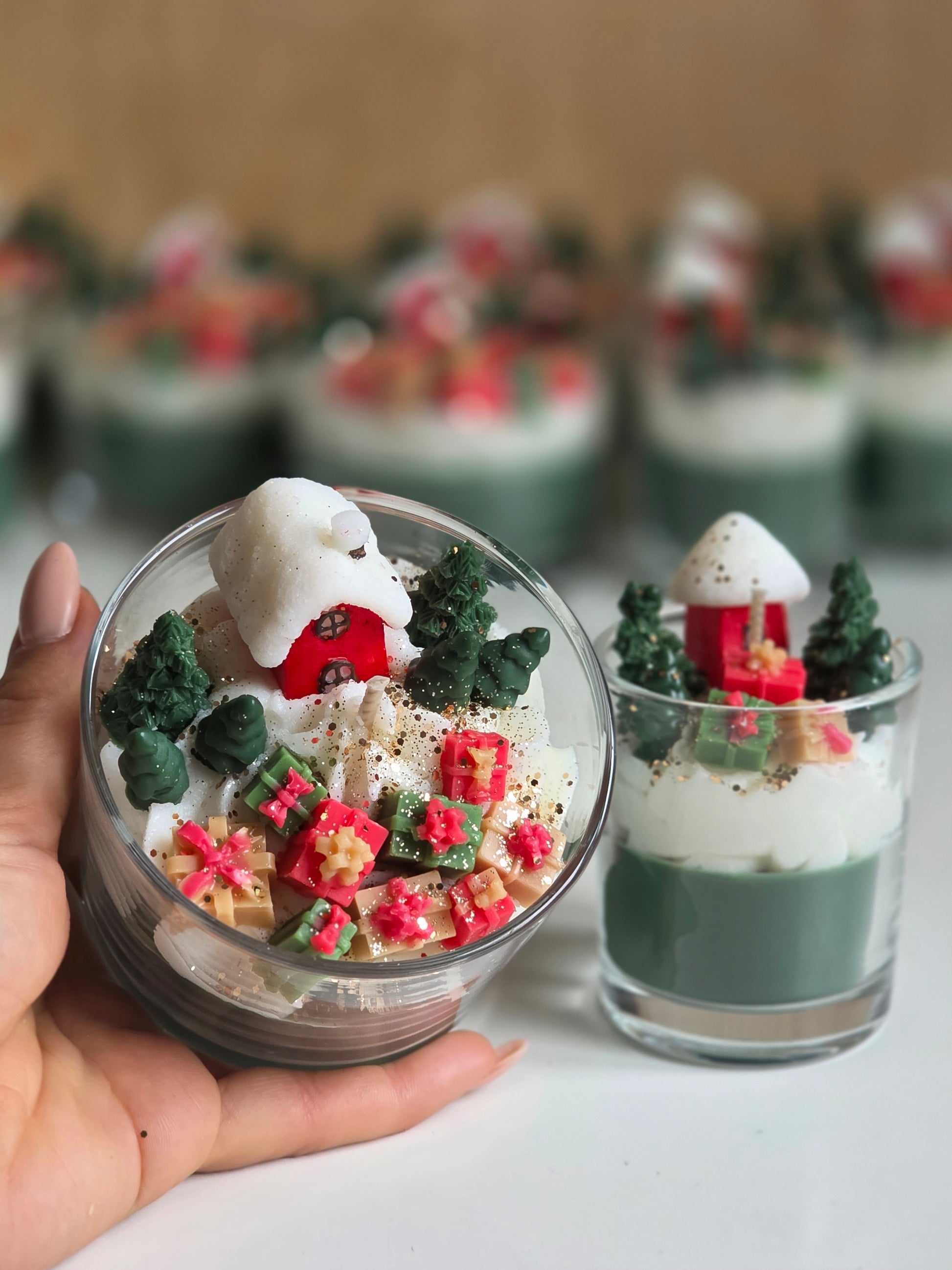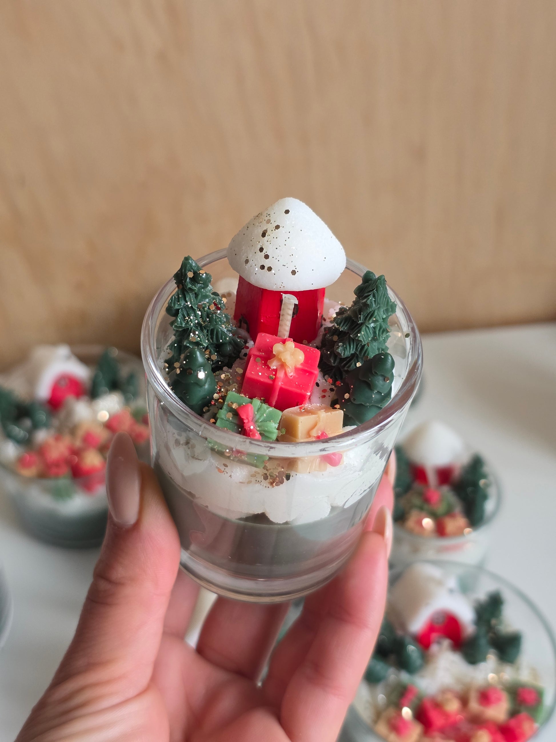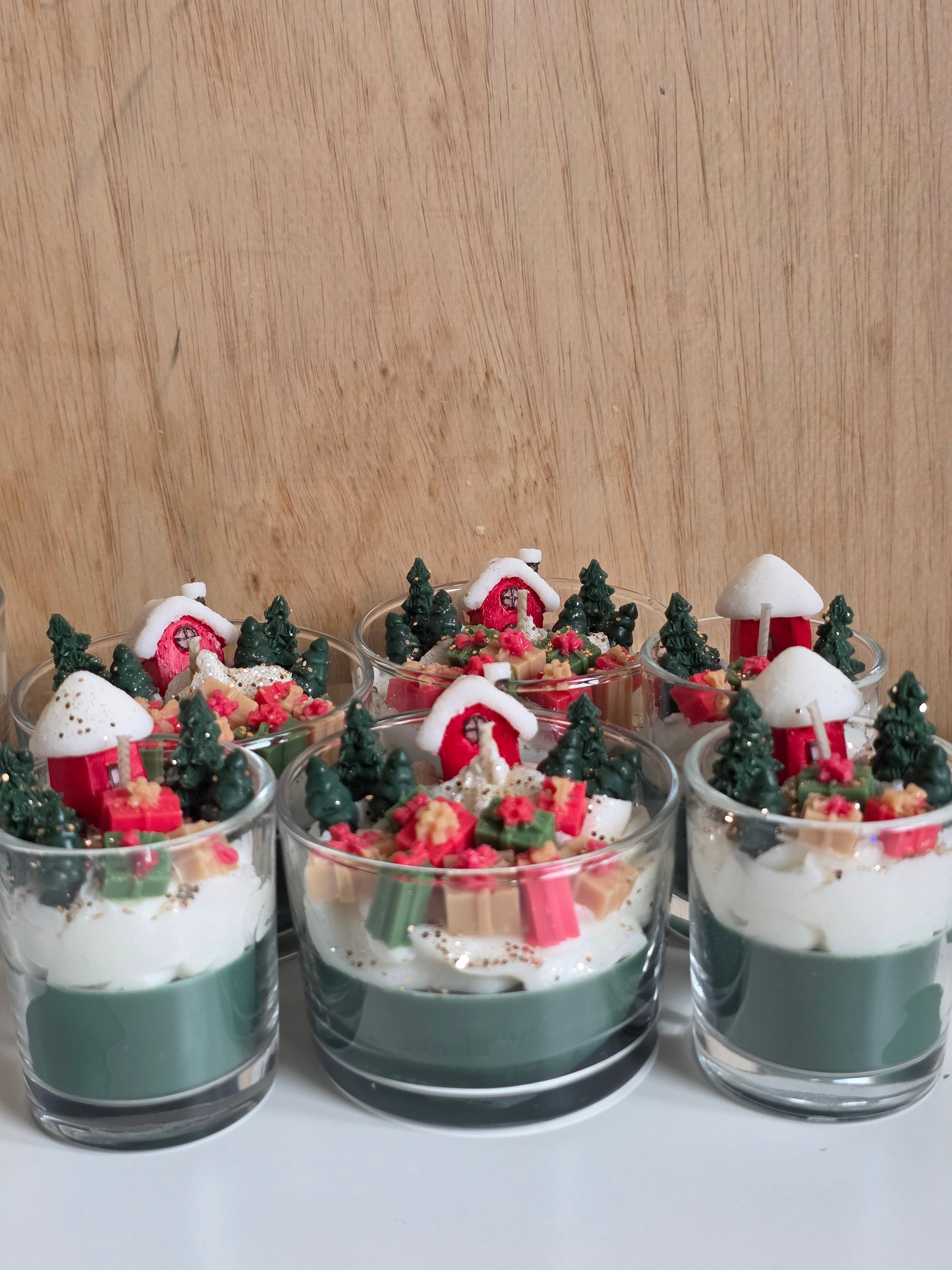 Adorned with miniature snowy cottages, evergreen trees, and tiny festive gifts, this candle transforms your space into a cozy holiday scene perfect for gifting or enjoying on a peaceful winter night.