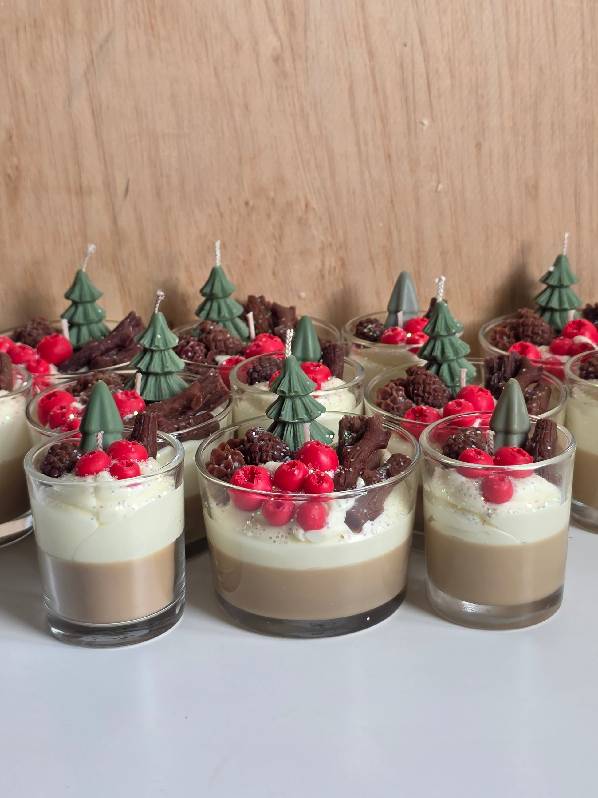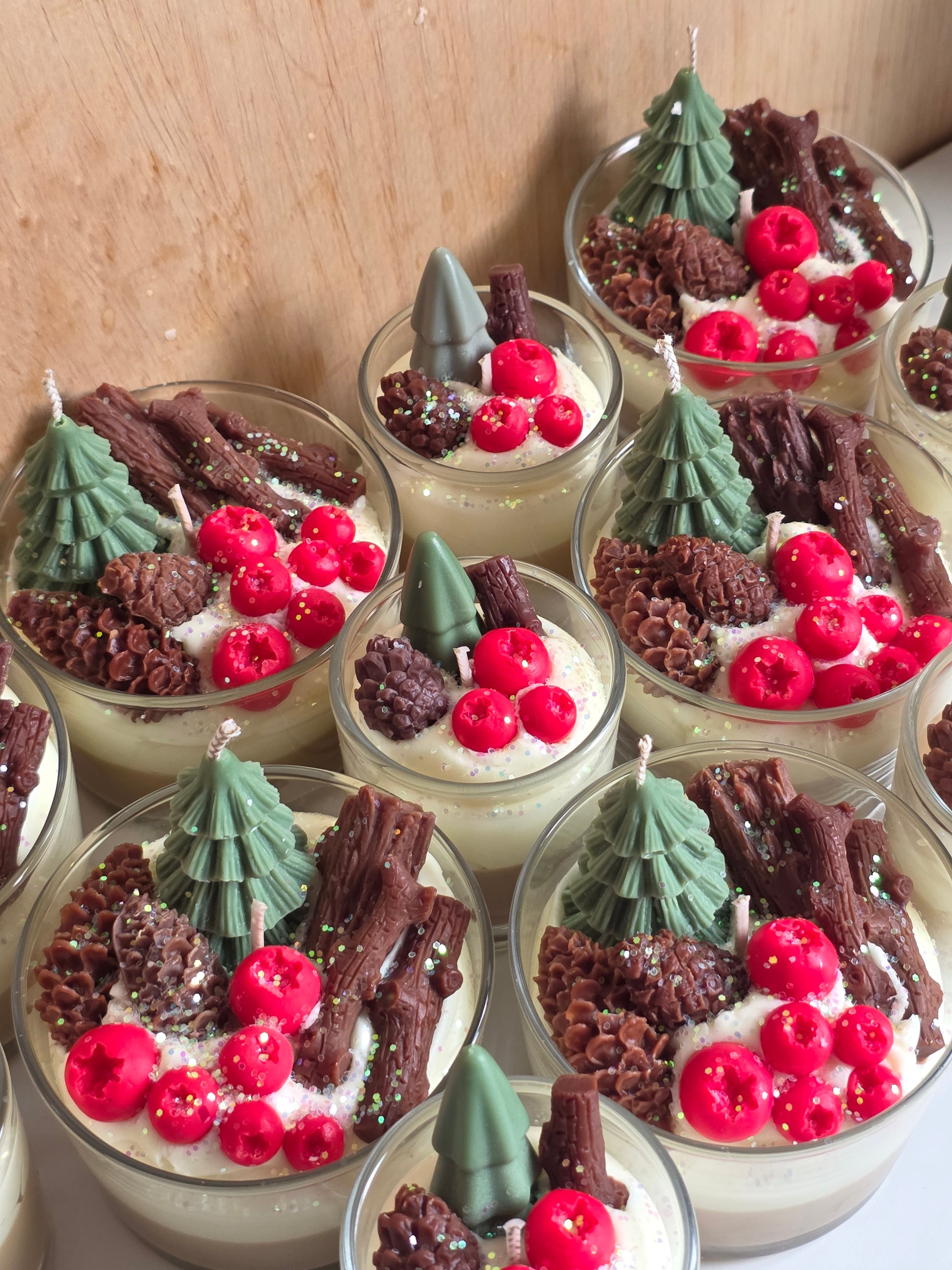 Each candle is artfully decorated with wax sculptures of evergreen trees, pinecones, berries, and logs, creating a charming winter scene that feels like a holiday story brought to life.